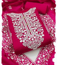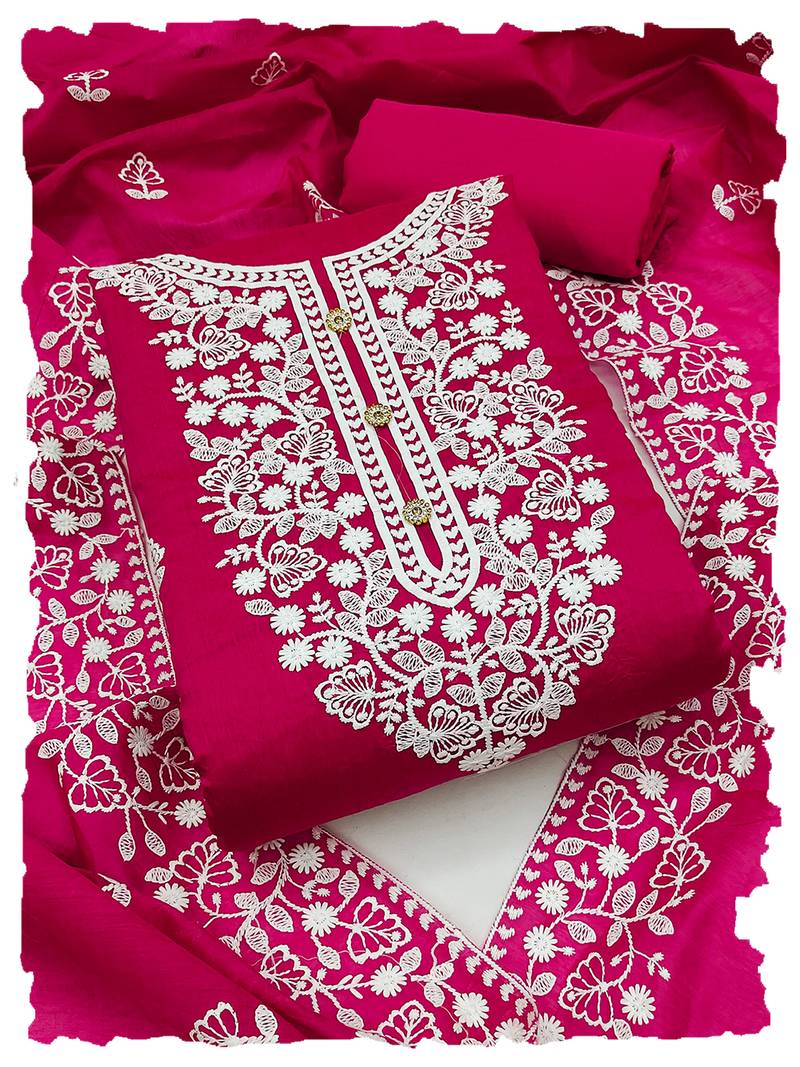 Women's rani pink chanderi cotton white embroidered lucknowi chikankari unstitched