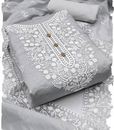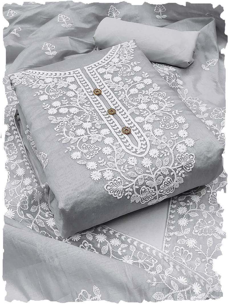Women's grey chanderi cotton white embroidered lucknowi chikankari unstitched