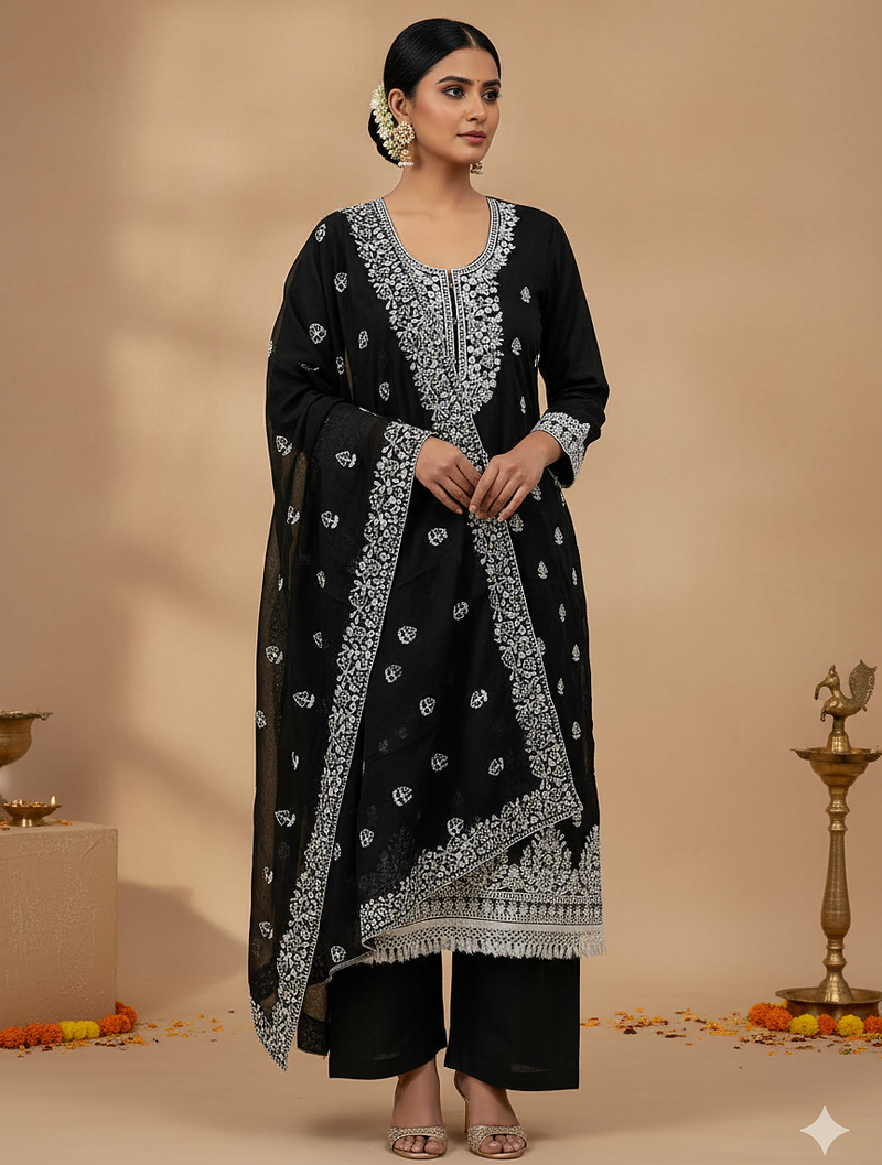 Product Name Women's Black Chanderi Cotton White Embroidered Lucknowi Chikankari