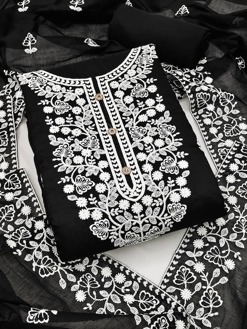 Women's black chanderi cotton white embroidered lucknowi chikankari unstitched