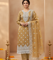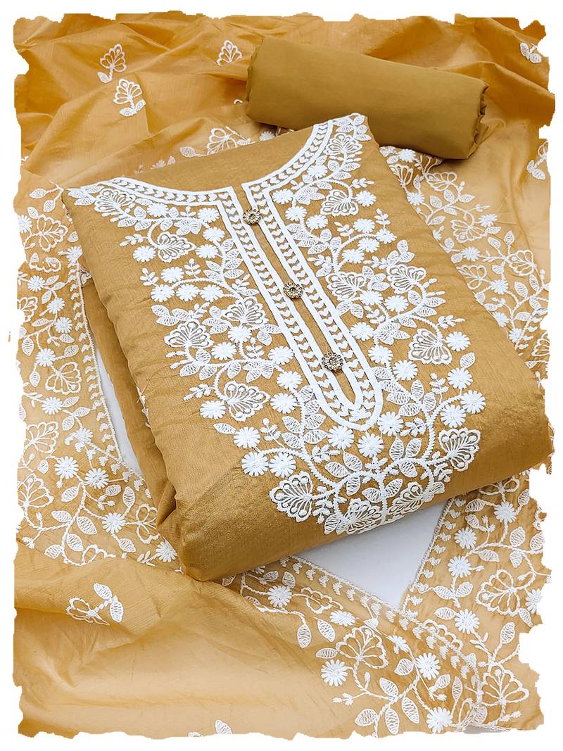 Women's beige chanderi cotton white embroidered lucknowi chikankari unstitched