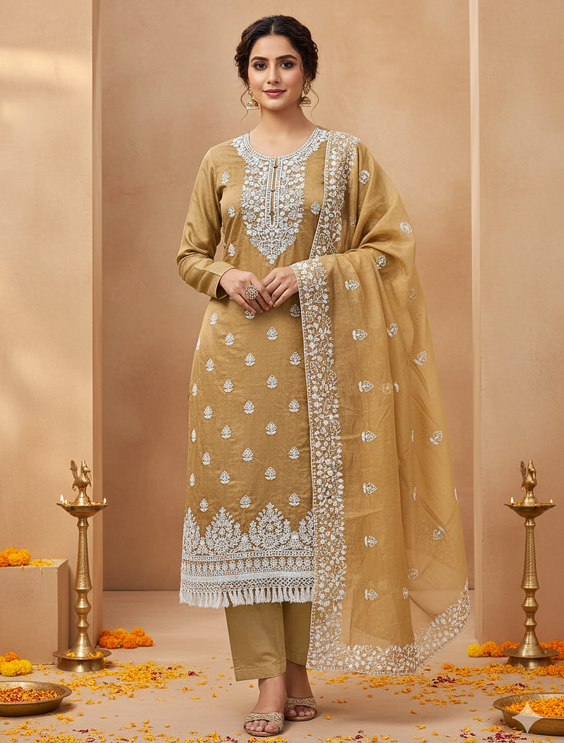 Product Name Women's Beige Chanderi Cotton White Embroidered Lucknowi Chikankari