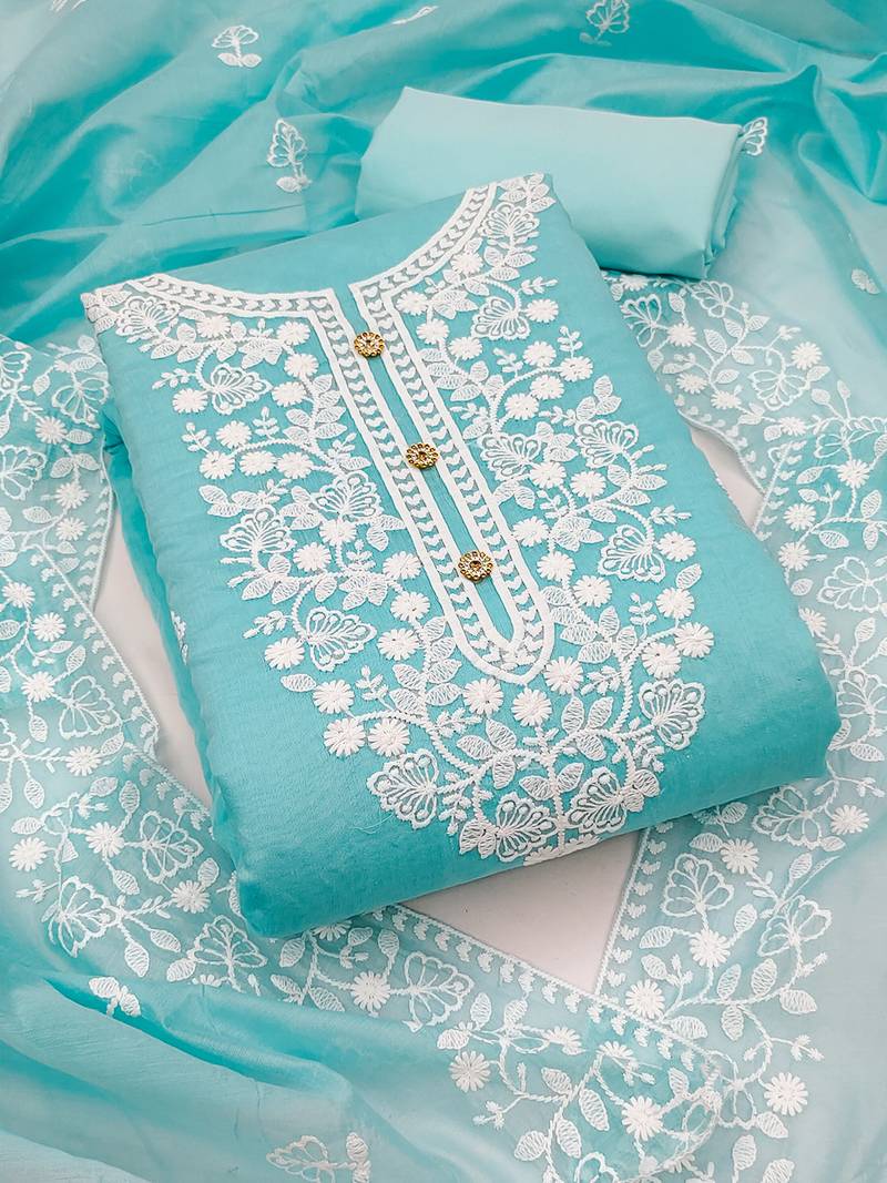 Women's blue chanderi cotton white embroidered lucknowi chikankari unstitched