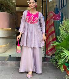 | Product Description | Add A Touch Of Elegance To Your Wardrobe With This Beautiful Lavender Kurti Set Featuring A Vibrant Pink Embroidered Yoke. Designed With Fine Floral Thread Work And Soft Pleated Detailing, This Outfit Offers A Stylish Yet Comfortable Fit. Paired With Matching Palazzo Pants, It Is Perfect For Festive Gatherings, Casual Outings, Or Daytime Events. The Breathable Fabric And Modern Silhouette Make It A Must Have Ethnic Piece. |