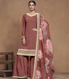 Brick brown roman silk heavy thread embroidery work with printed dupatta salwar kameez (palazzo free size stitched) semi stitched
