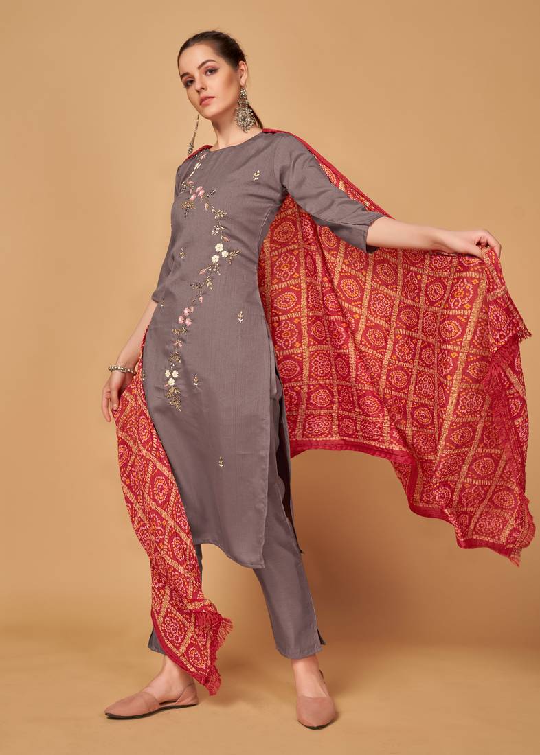 | Product Description | Top Fabric: Lord Silk, Top Color: Ligth Burgendy, Bottom Fabric: Vortex Viscose, Bottom Color: Ligth Burgendy, Dupatta Fabric: Viscose Bandhani, Dupatta Color: Red, Work: Thread Embroidery & Hand Work With Bandhani Dupatta, Remark: Fully Stitched With M(38), L(40), Xl(42) Size |