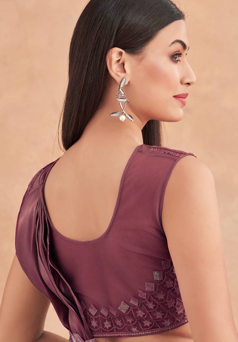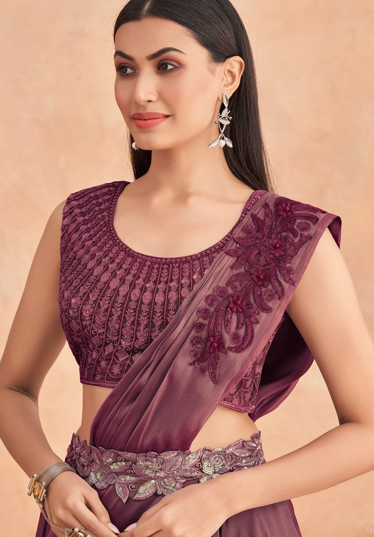 Magenta embroidered satin saree with blouse