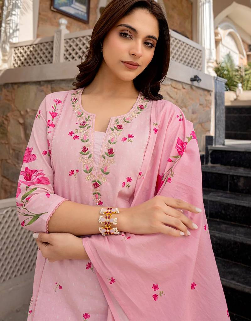 | Product Description | Top Fabric: Chanderi Butti, Top Color: Pink, Bottom Fabric: Chanderi, Bottom Color: Pink, Dupatta Fabric: Chanderi, Dupatta Color: Pink, Work: Printed, Remark: Kurta Pant Set (Size S,M,L,Xl,Xxl), Note: There Might Be Slight Color Variation Due To Lightings & Flash While Photo Shoot. |
