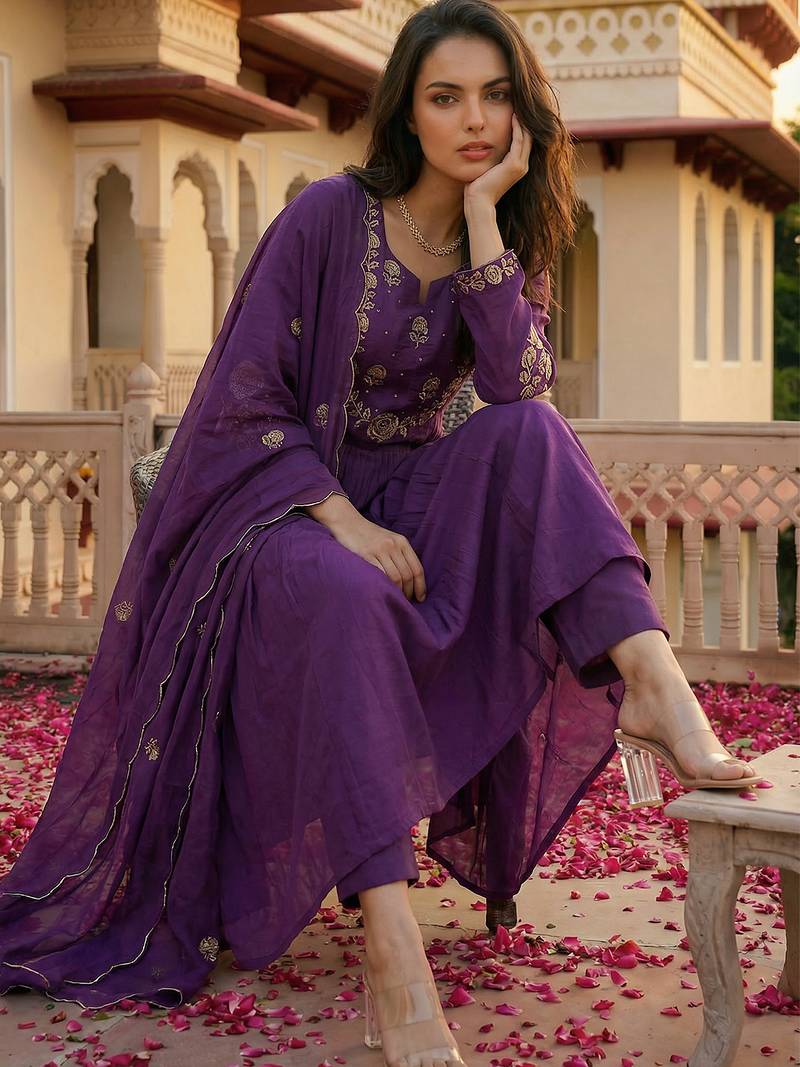 | Product Description | Top Fabric: Chanderi S Ilk, Top Color: Purple, Bottom Fabric: Chanderi S Ilk, Bottom Color: Purple, Dupatta Fabric: Organza, Dupatta Color: Purple, Work: Heavy Thread Embroidery Work, Remark: Kurta Pant Set (Size S,M,L,Xl,Xxl), Note: There Might Be Slight Color Variation Due To Lightings & Flash While Photo Shoot. |