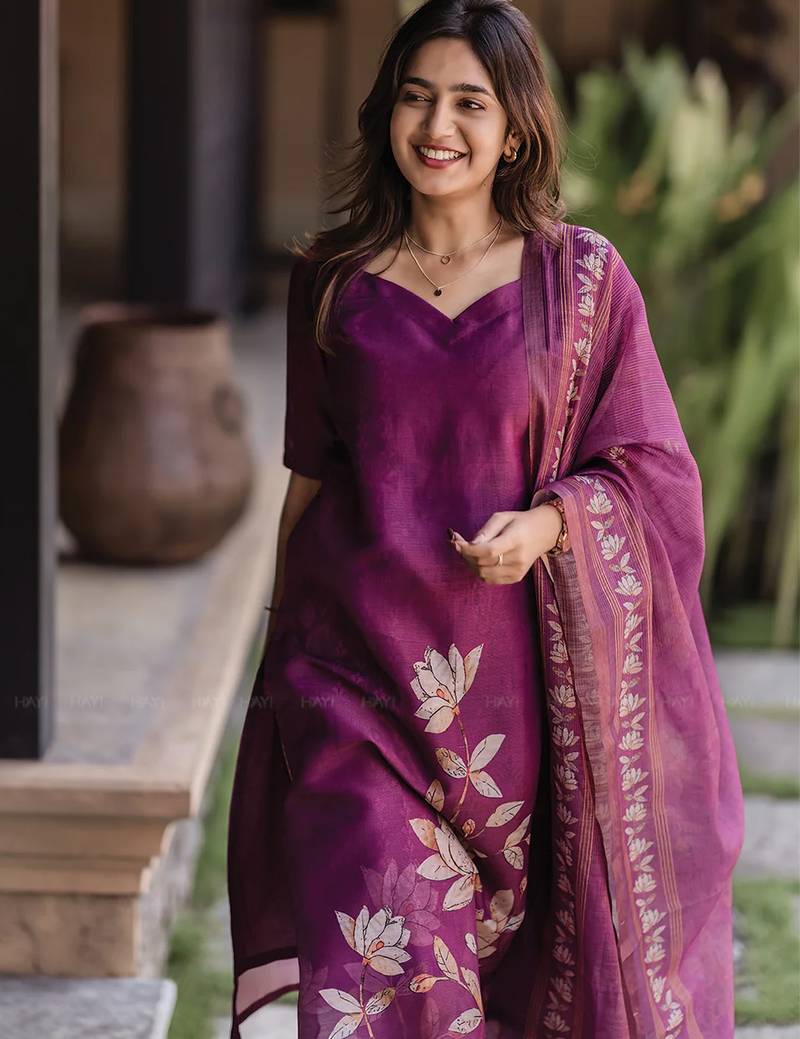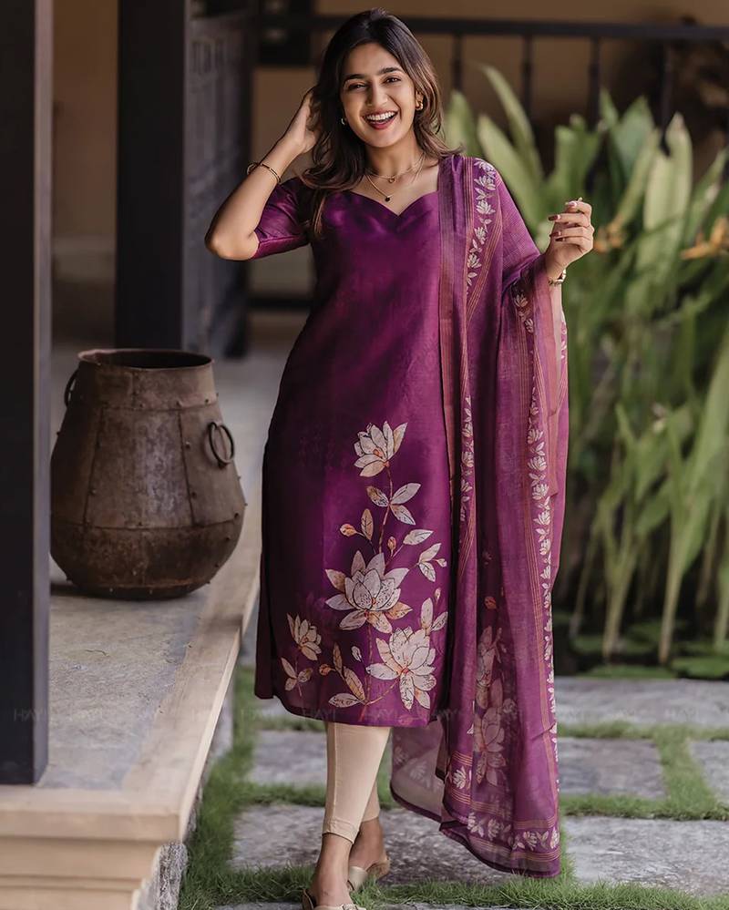 | Product Description | Top Fabric: Zarna Silk, Top Color: Purple, Dupatta Fabric: Zarna Silk, Dupatta Color: Purple, Work: Printed, Remark: Kurti With Dupatta (Size S,M,L,Xl,Xxl), Note: There Might Be Slight Color Variation Due To Lightings & Flash While Photo Shoot. |