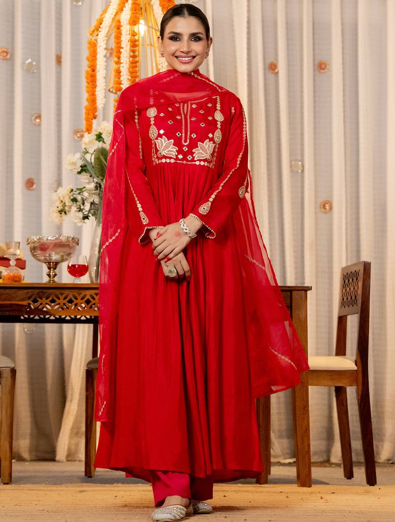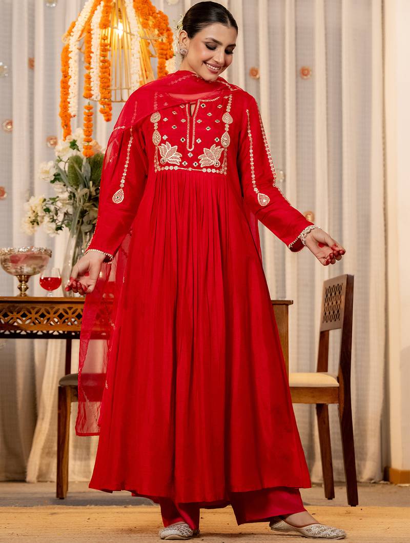 | Product Description | Top Fabric: Chanderi Silk, Top Color: Red, Bottom Fabric: Chanderi Silk, Bottom Color: Red, Dupatta Fabric: Organza, Dupatta Color: Red, Work: Heavy Thread Embroidery Work, Remark: Kurta Pant Set (Size S,M,L,Xl,Xxl), Note: There Might Be Slight Color Variation Due To Lightings & Flash While Photo Shoot. |
