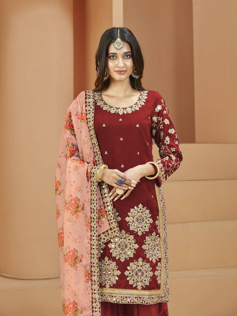 | Product Description | Top Fabric: Art Silk, Top Color: Red, Bottom Fabric: Santoon, Bottom Color: Red, Dupatta Fabric: Organza, Dupatta Color: Peach, Inner Fabric: Santoon, Work: Heavy Thread Embroidery Zari, Mirror & Diamond Work With Printed Dupatta, Remark: Salwar Kameez |
