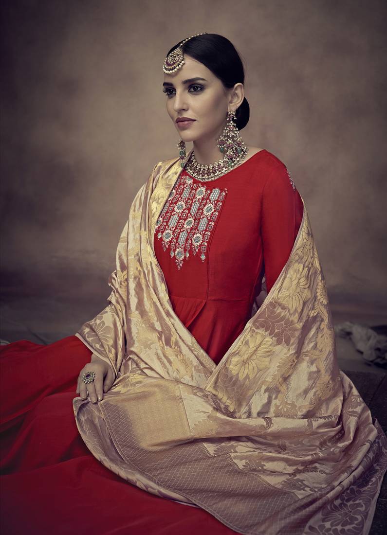| Product Description | Top Fabric: Rayon, Top Color: Red, Bottom Fabric: Santoon, Bottom Color: Red, Dupatta Fabric: Banarasi, Dupatta Color: Cream, Work: Heavy Thread Embroidery And Hand Work On Neck & Sleeve, Salwar Kameez |