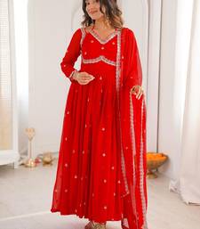 Top Fabric: Georgette, Top Color: Red, Bottom Fabric: Viscose, Bottom Color: Red, Dupatta Fabric: Georgette, Dupatta Color: Red, Work: Heavy Thread Embroidery Work, Remark: Kurta Pant Set (Size S,M,L,Xl,Xxl), Note: There Might Be Slight Color Variation Due To Lightings & Flash While Photo Shoot.