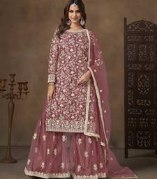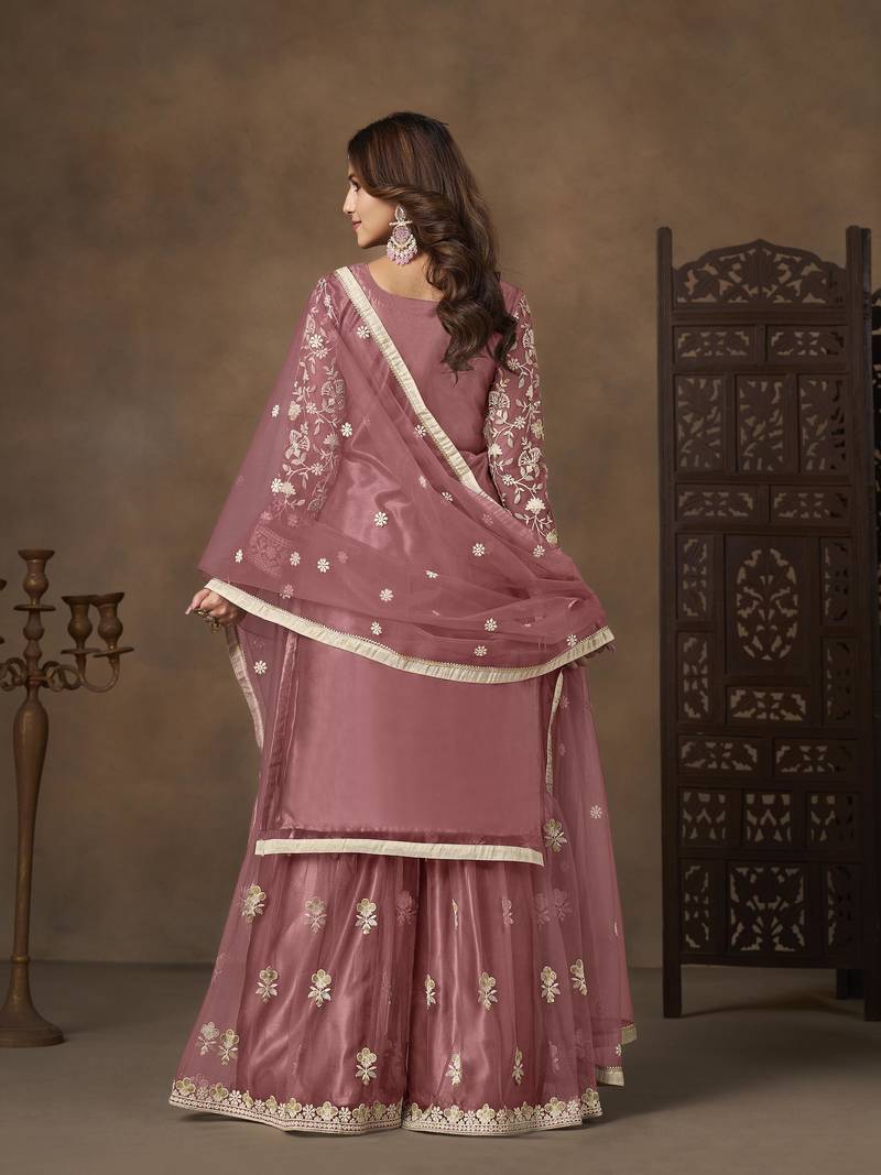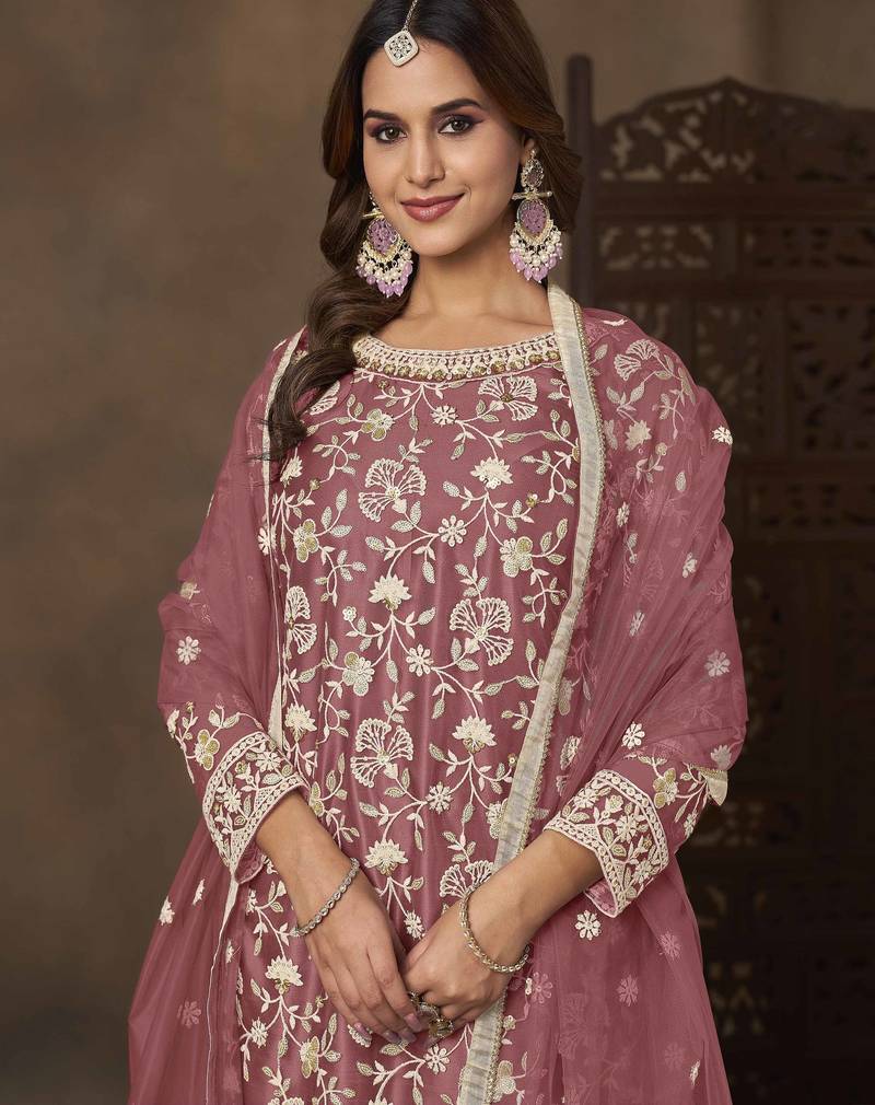 Rose pink net heavy thread embroidery with sequins work palazzo suit semi stitched