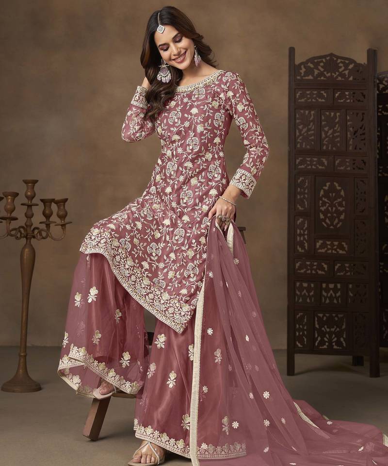 | Product Name | Rose Pink Net Heavy Thread Embroidery With Sequins Work Palazzo Suit | |