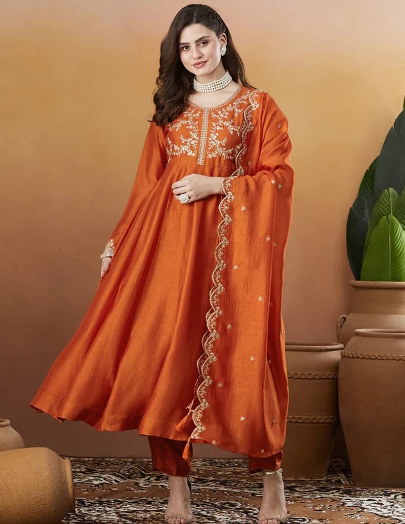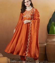 | Product Description | Top Fabric: Vichitra Silk, Top Color: Rust Orange, Bottom Fabric: Vichitra Silk, Bottom Color: Rust Orange, Dupatta Fabric: Vichitra, Dupatta Color: Rust Orange, Work: Thread Embroidered With Sequins Work, Remark: Kurta Pant Set (Size S,M,L,Xl,Xxl), Note: There Might Be Slight Color Variation Due To Lightings & Flash While Photo Shoot. |