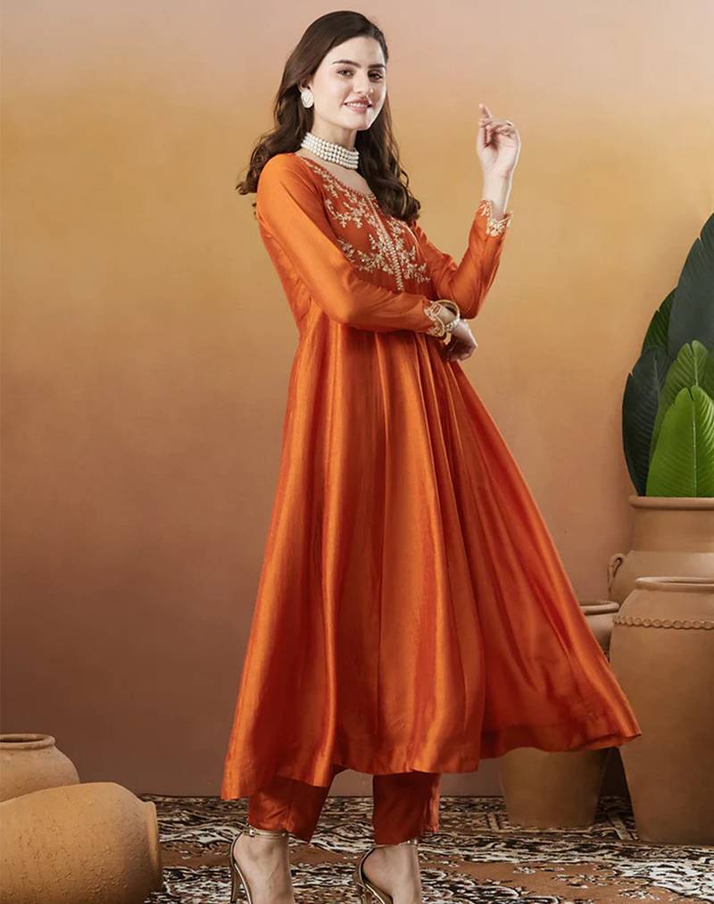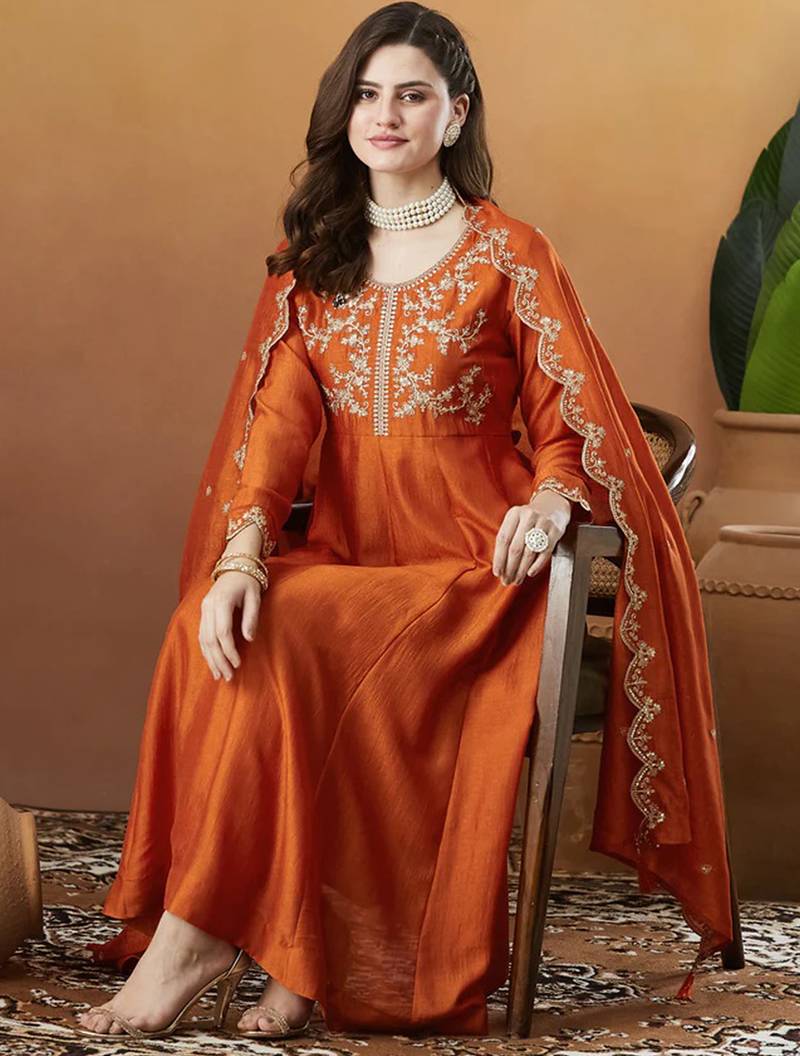 | Product Name | Rust Orange Vichitra Silk Thread Embroidered With Sequins Work Kurta Pant Set | |