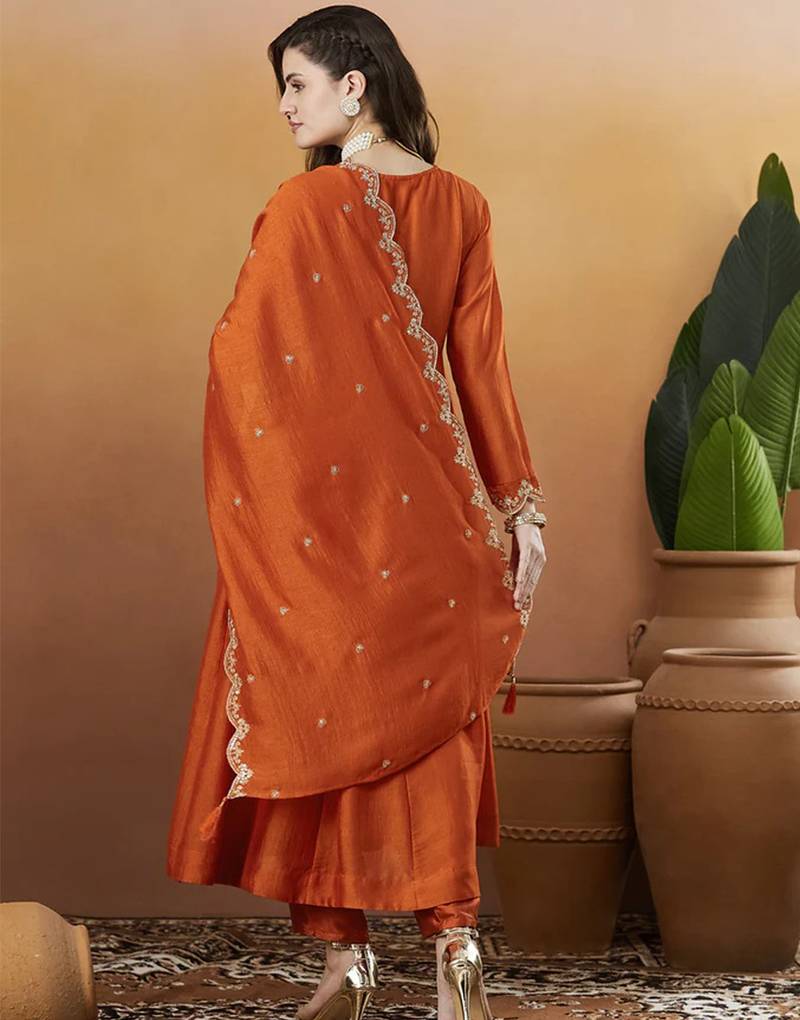 Rust orange vichitra silk thread embroidered with sequins work kurta pant set