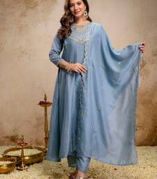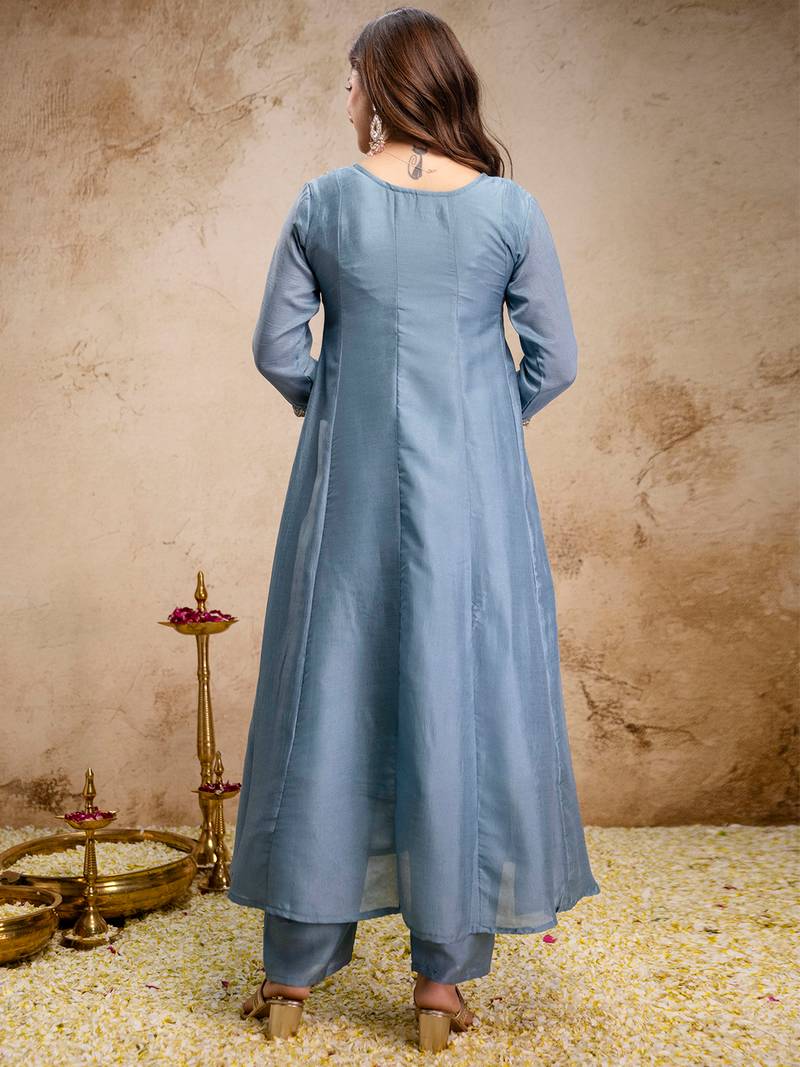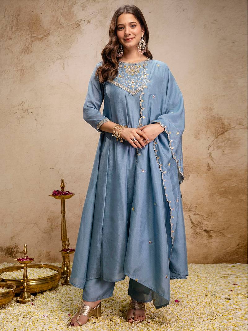 | Product Name | Sky Blue Vichitra Silk Heavy Thread Embroidery Work Kurta Pant Set | |
