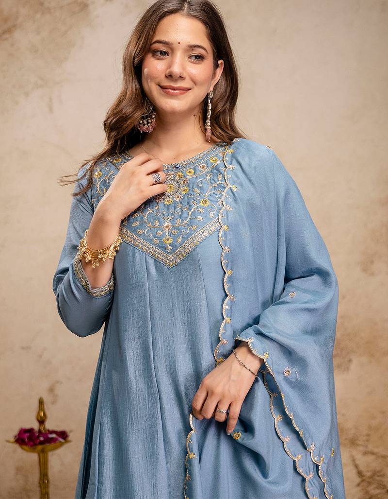Sky blue vichitra silk heavy thread embroidery work kurta pant set