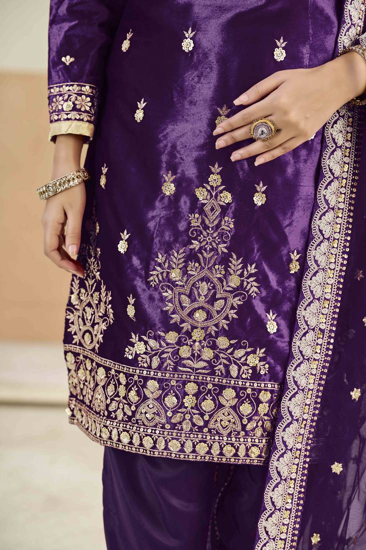 Violet ice velvet heavy thread embroidery with sequins work salwar kameez semi stitched