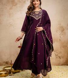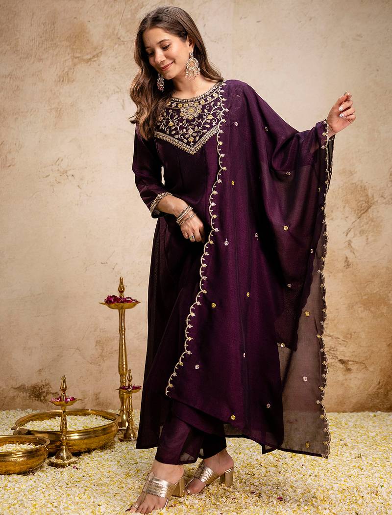 | Product Description | Top Fabric: Vichitra Silk, Top Color: Wine, Bottom Fabric: Vichitra Silk, Bottom Color: Wine, Dupatta Fabric: Vichitra Silk, Dupatta Color: Wine, Work: Heavy Thread Embroidery Work, Remark: Kurta Pant Set (Size S,M,L,Xl,Xxl), Note: There Might Be Slight Color Variation Due To Lightings & Flash While Photo Shoot. |