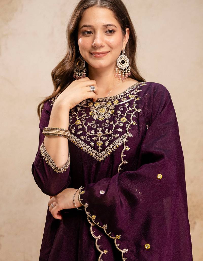 Wine vichitra silk heavy thread embroidery work kurta pant set