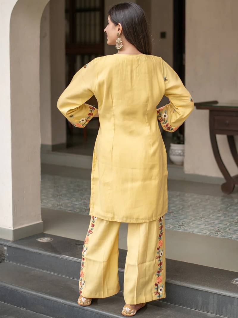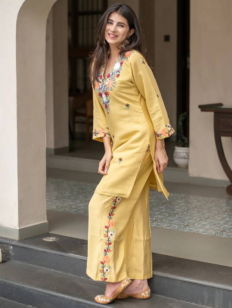Yellow french crepe heavy thread embroidery work kurta with pant