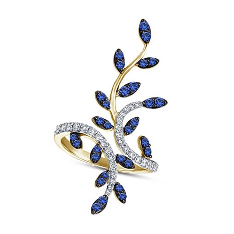 Gorgious blue sapphire & white cz adjustable leaf ring 14k gold plated 925 sterling silver for girls::Womens