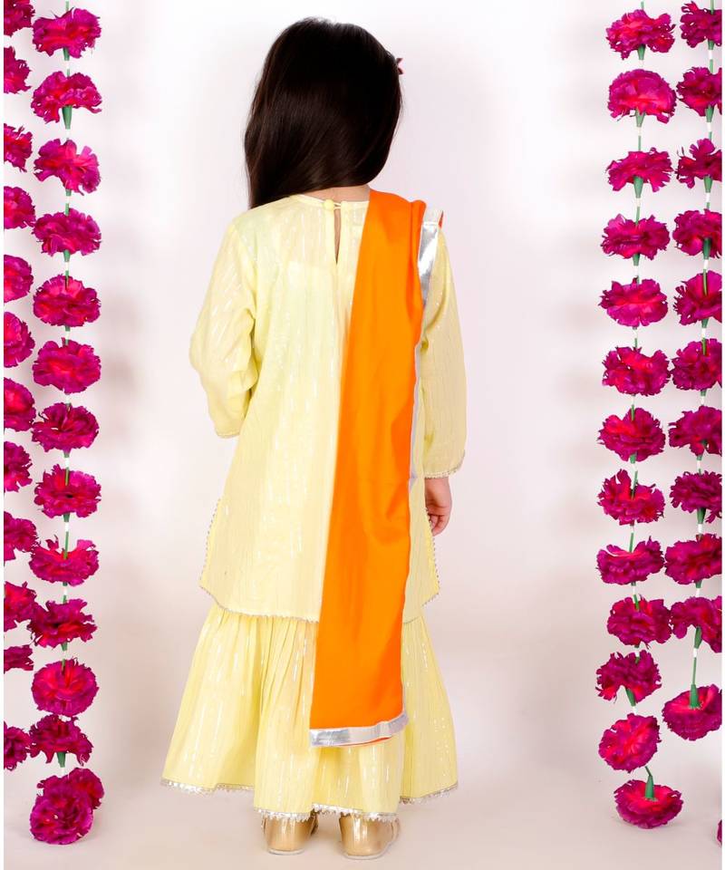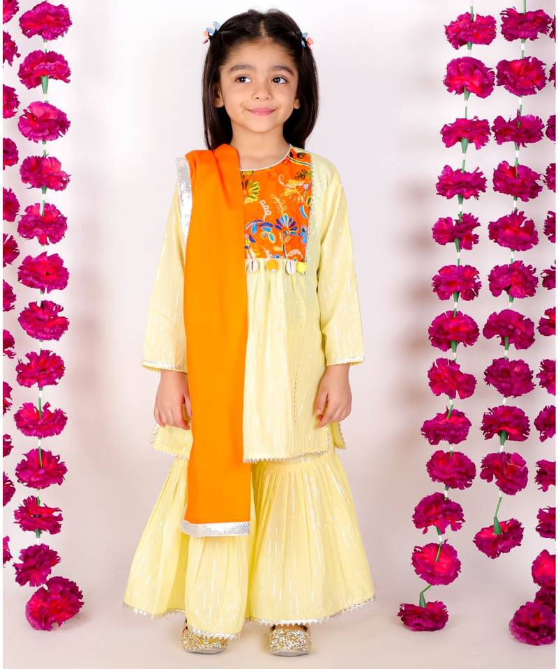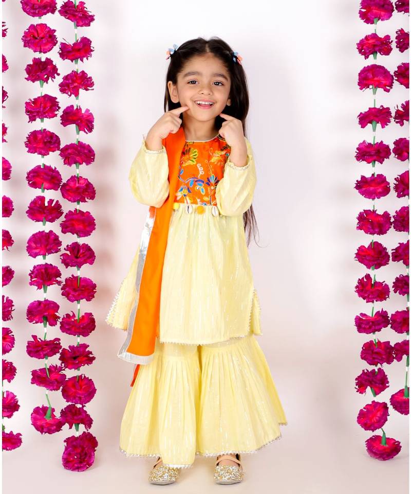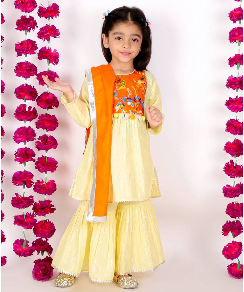 | Product Name | Embroidery Mirror Work Kurta Frock With Sharara And Dupatta Yellow And Orange | |