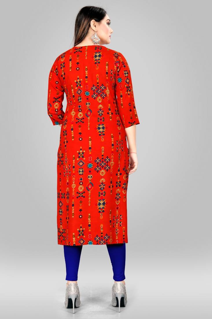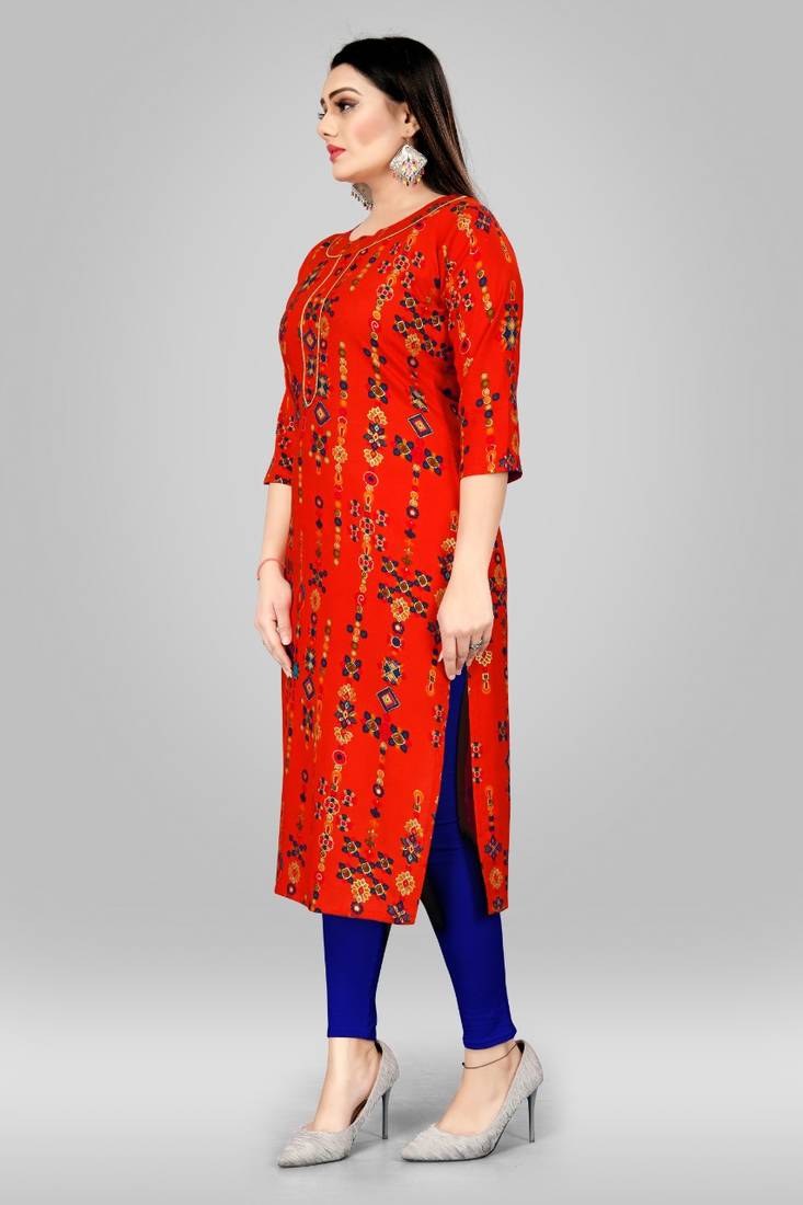Livuniq's 14kg orange color rayon printed kurti: elevate your style with comfort and luxury