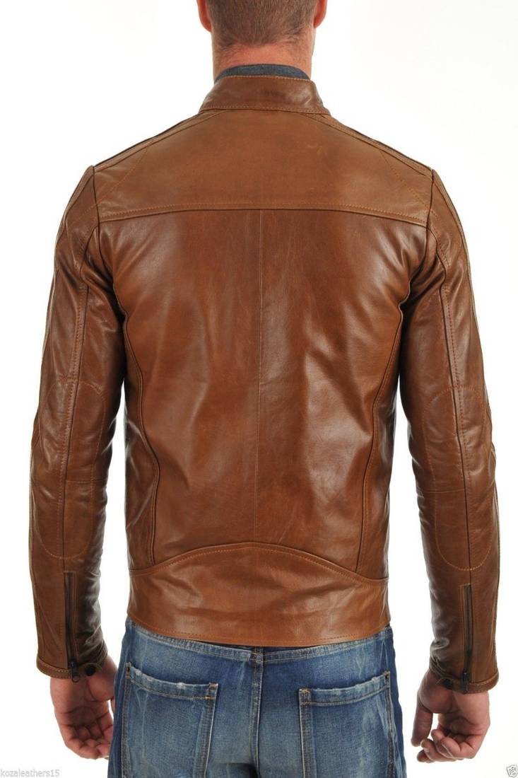 Men's vintage cafe racer brown leather biker moto slim fit jacket