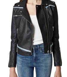 Women's lambskin leather jacket denim trim real leather moto jacket