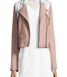 Women’s pink & white real leather biker jacket asymmetrical zip, stylish slim fit