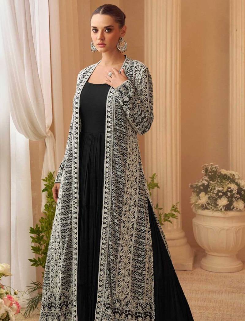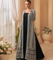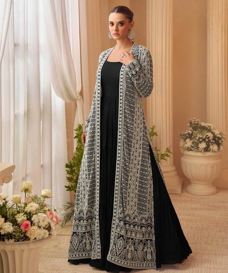 | Product Name | Black Chinon Silk Anarkali Jacket Suit With Heavy Zari, Thread And Sequins Work, Free Size Stitched. | |