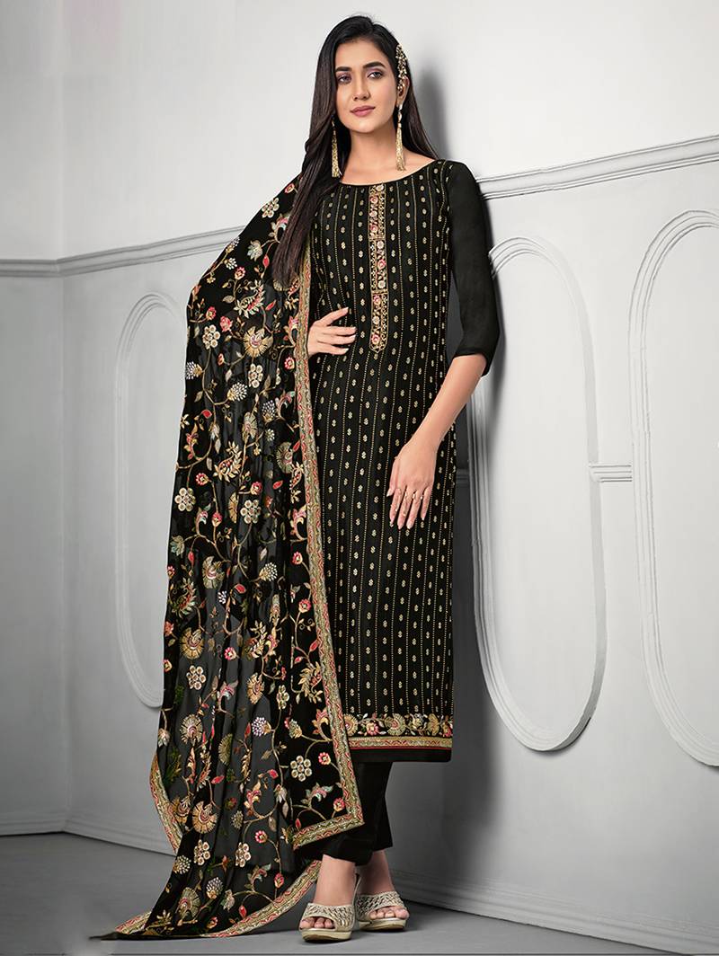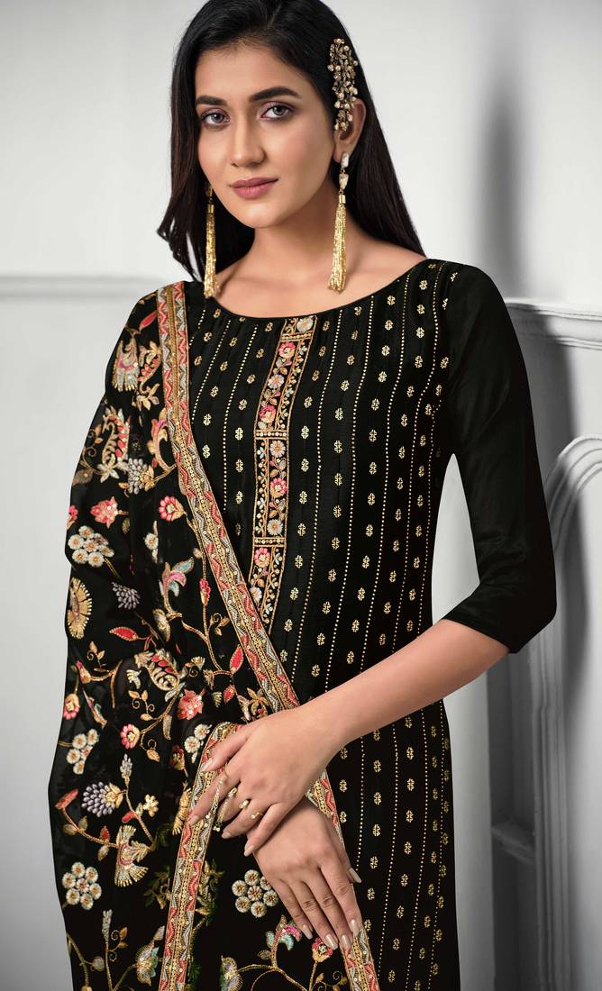 | Product Name | Black Chinon Straight Pant Suit With Embroidery And Sequins Work, Free Size Stitched. | |