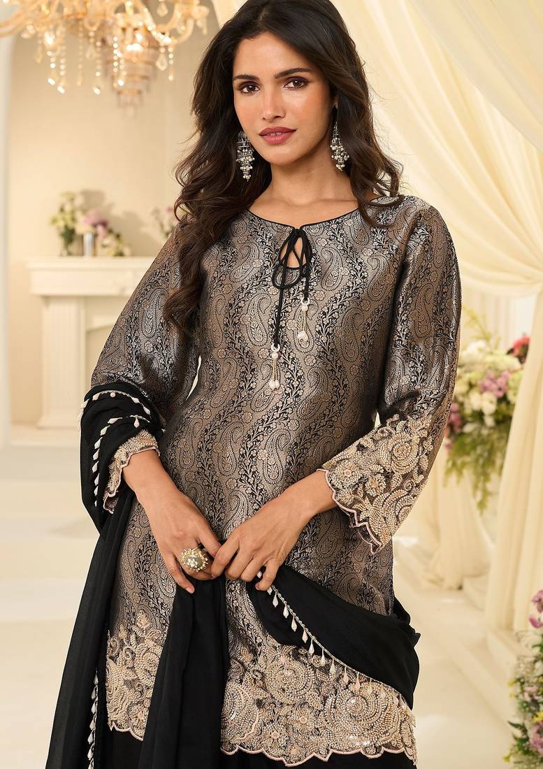 | Product Name | Black Silk Blend Sequins Work Salwar Suits Free Size Up To 42 | |
