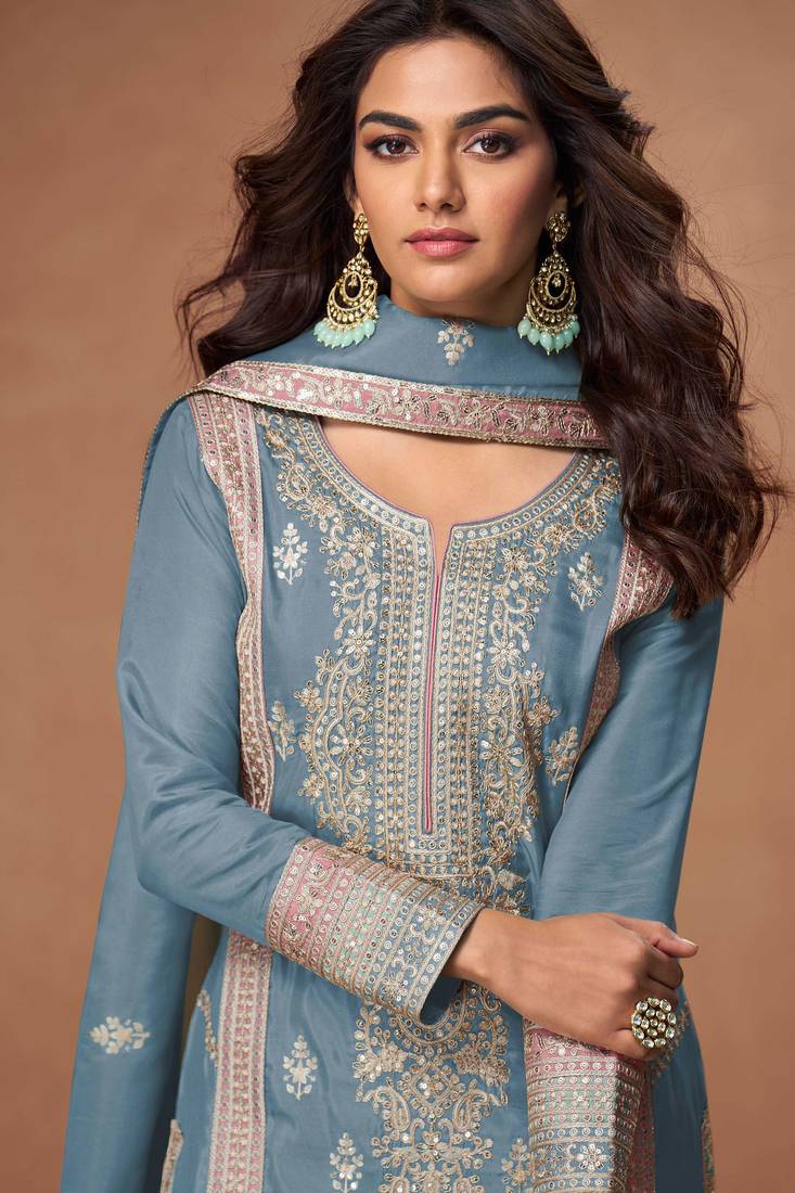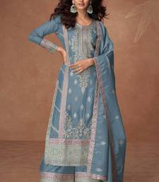 | Product Name | Blue Embroidery & Sequins Work Chinnon Silk Straight Palazzo Free Size Stitching (Size Upto 42") | |