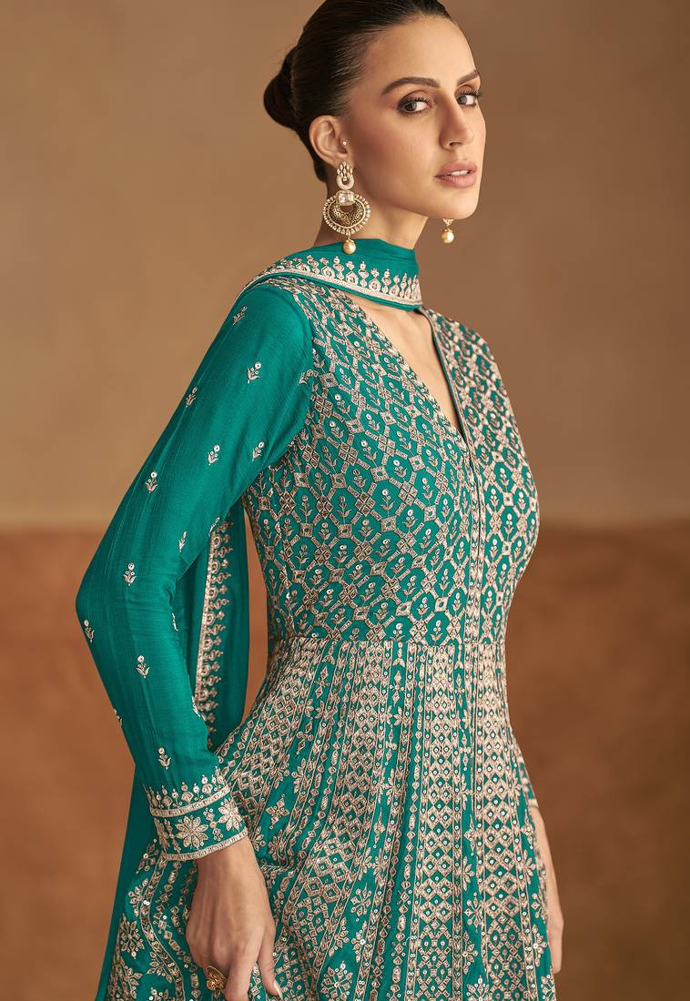 | Product Name | Blue Embroidery & Sequins Work Chinon Gown Free Size Stitching (Size Upto 42") | |