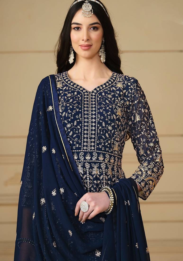 | Product Name | Blue Georgette Embroidered & Sequins Semi Stitched Suit Size Up To 42 | |
