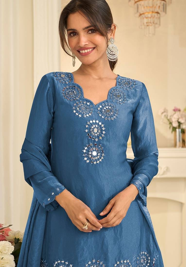 Blue silk blend mirror work salwar suits free size up to 42 stitched
