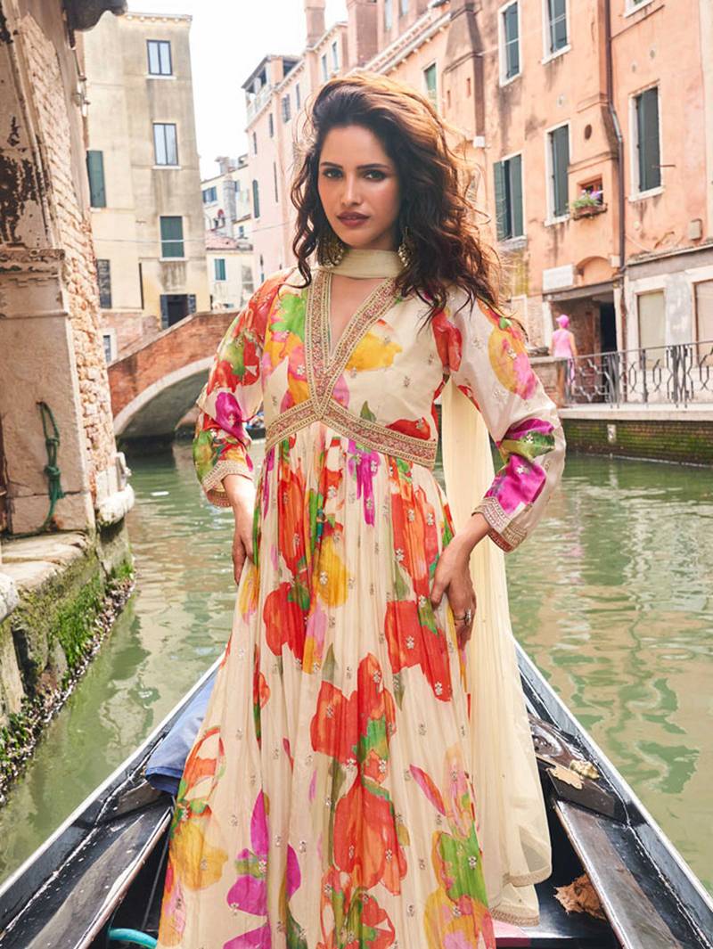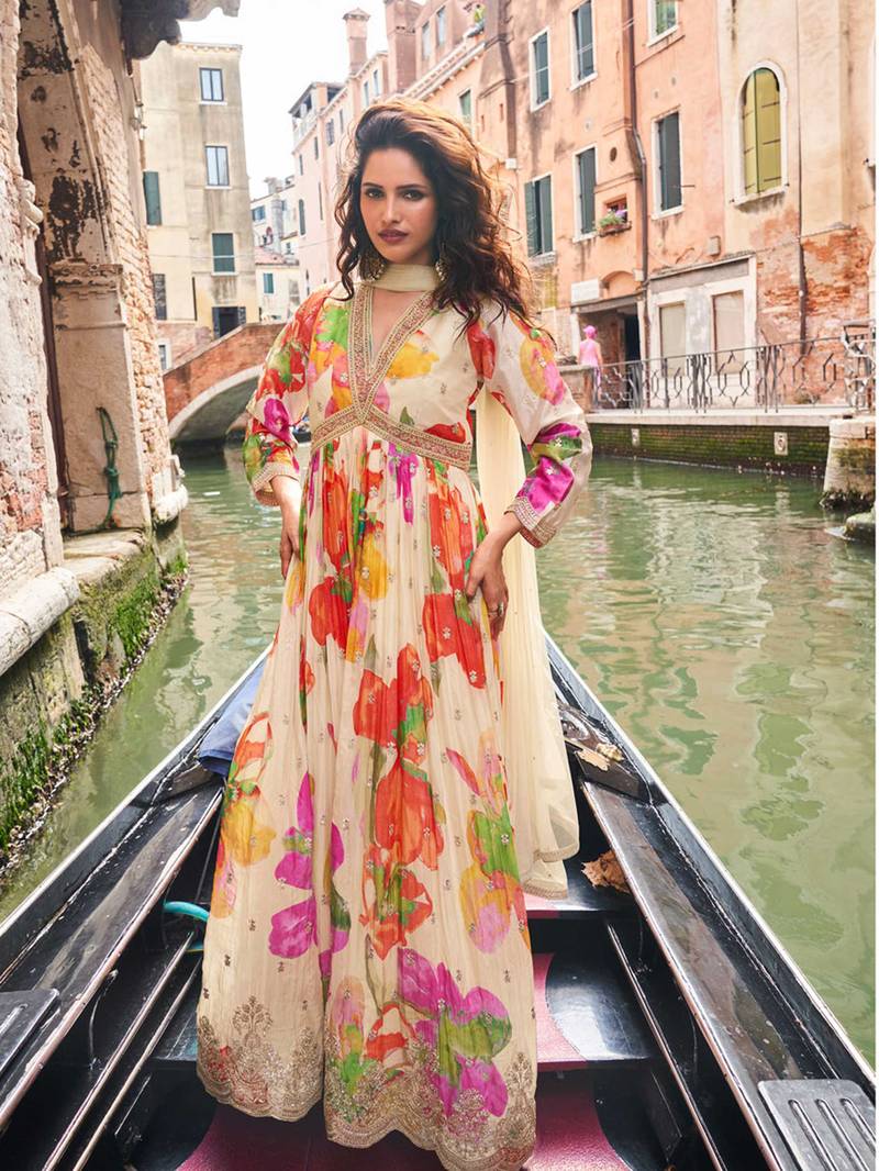 Cream chinon silk anarkali gown suit with intricate zari and sequins embroidery, free-size stitched.