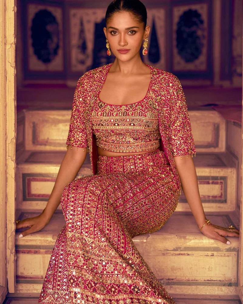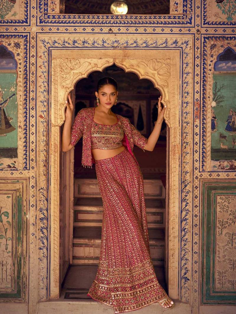 Fuchsia pink georgette blouse palazzo suit with embroidery, seroski zarkan, stone, sequin & beads, free-size stitched.