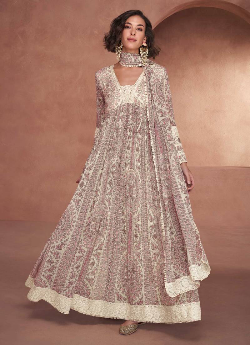 Georgette printed cream semi stitched anarkali suit up to 42" size