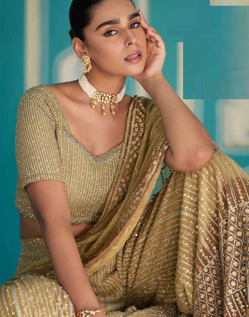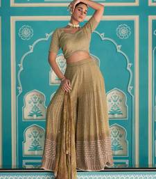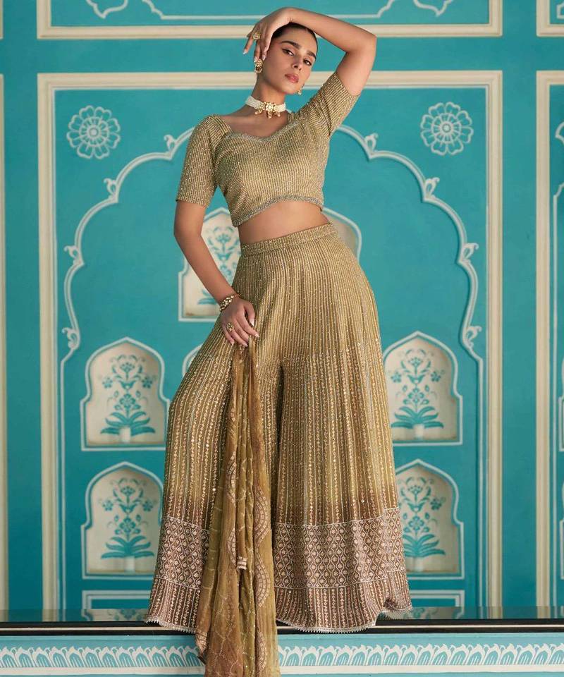 Gold georgette blouse palazzo suit with sequin, zari weaving & shimmer embroidery, free-size stitched.