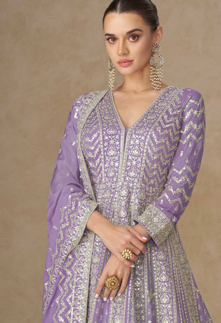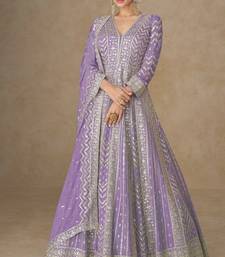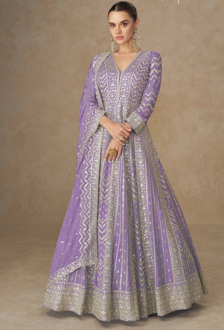 Lavendar zari emboidery and sequince work chinnon silk anarkali - free size stitching (size upto 42") stitched