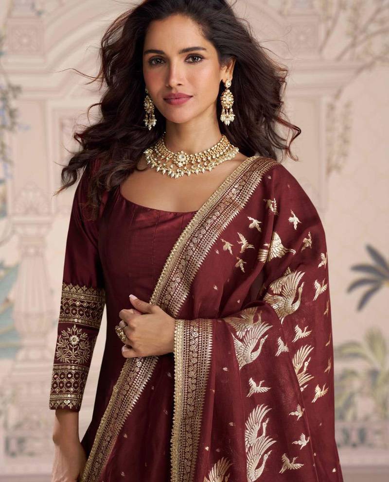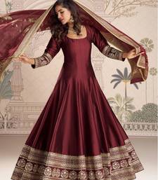 Maroon embroidered , sequence , jacquard & embellished work silk gown - free size stitching (size upto 42") stitched