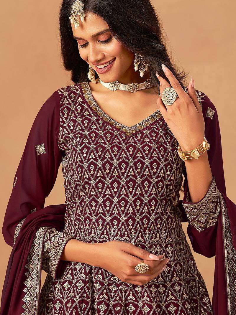Maroon georgette mirror work semi stitched salwar suits suits size up to 42