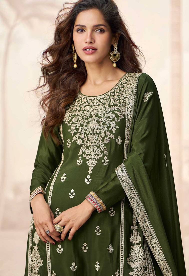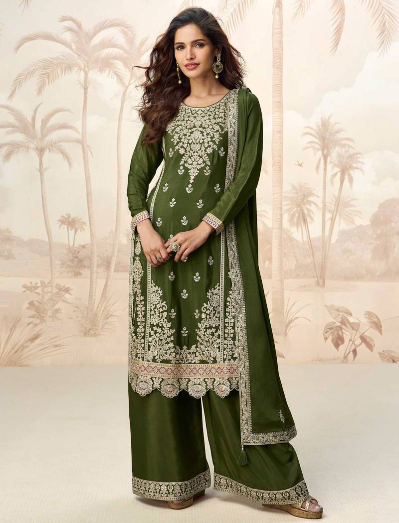 Product Name | Mehndi Green Embroidery & Sequins Work Chinnon Silk Straight Palazzo Suit Free Size Stitching (Size Upto 42") | |